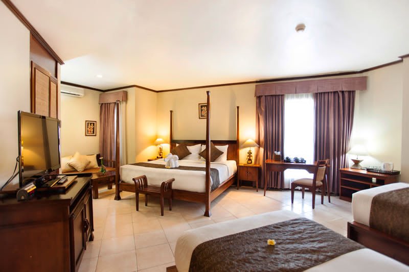 Family Room Ramayana Resort and Spa is a modern spacious room with 63 square meters size ideally for family travelers who want to stay in Kuta. Furthermore, this Family Room is equipped by one king size bed and 2 single beds. It is fit for 2 adults with 2 children or 4 people friendship. Meanwhile, the room is beautiful with Balinese architecture describing on the room decor as well as design. Moreover, the room is furnished by the wooden furniture reflecting to the chairs, tables as well as bed headboard. There are many spaces for personal items including safe deposit box to keep your valuable things. Meanwhile, the en-suite bathroom is elegantly designed with bathtub and shower separately. And also, the wash basin, dressing mirror and other bathroom amenities are completing this room.